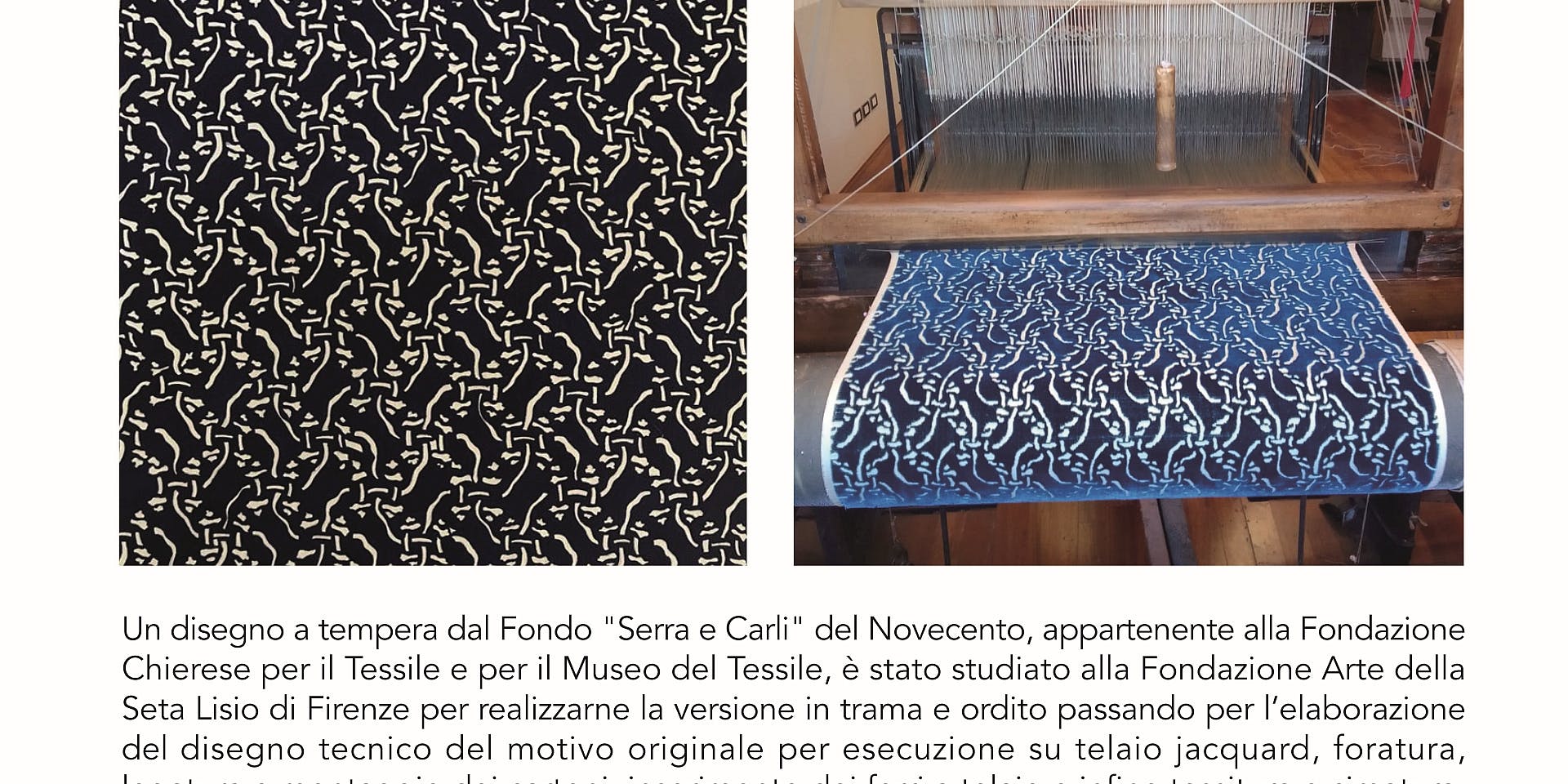 Un disegno a tempera dal Fondo chierese "Serra e Carli" del Novecento è stato studiato nella storica manifattura fiorentina per realizzarne la versione in trama e ordito. Il progetto “Nodo Chieri-Firenze” si è articolato in elaborazione del disegno tecnico per la tessitura del motivo originale su telaio jacquard, foratura, legatura e montaggio dei cartoni, inserimento dei ferri a telaio e infine tessitura e cimatura. Il risultato è uno splendido velluto tagliato, prodotto in tre varianti colore - blu, rosso, verde.