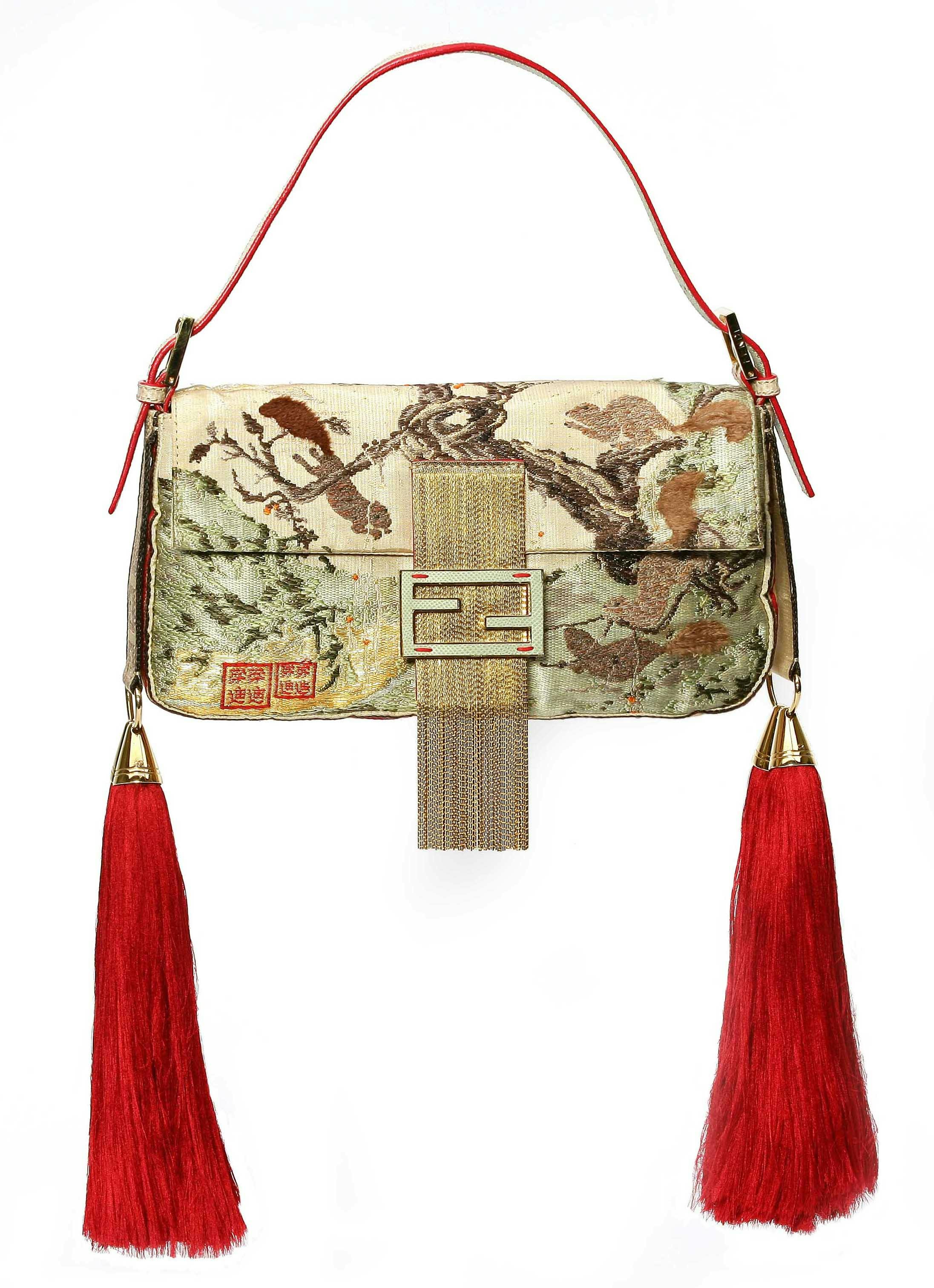 The collaboration between Fendi and the Fondazione Arte della Seta Lisio is a perfect example of italian savoir faire and excellence in craftsmanship. In a successful blend of innovation and tradition, the most modern design technologies merge with time-tested production techniques for velvets, silk brocades, and precious metals, which the Fondazione has protected and passed on since its founding in 1971. From 1997 to 2004, as well as for the groundbreaking fashion show held in 2007 on the Great Wall of China, the Fondazione Lisio has created velvets, brocades and silks decorated with antique motifs. Fendi has worked side by side the Fondazione Lisio for every phase of the articulated design process for twelve Baguette models, all of which have been created with hand-stitched fabrics produced on the Fondazione legendary looms. The first Baguette in 1997, created with a patterned velvet that defi nes and highlights Fendi's double F monogram, pays a homage to the ancient art of hand-weaving valuable velvets, a technique in Italian manufacturing that achieved its splendid apex from the fifteenth to the eighteenth centuries.