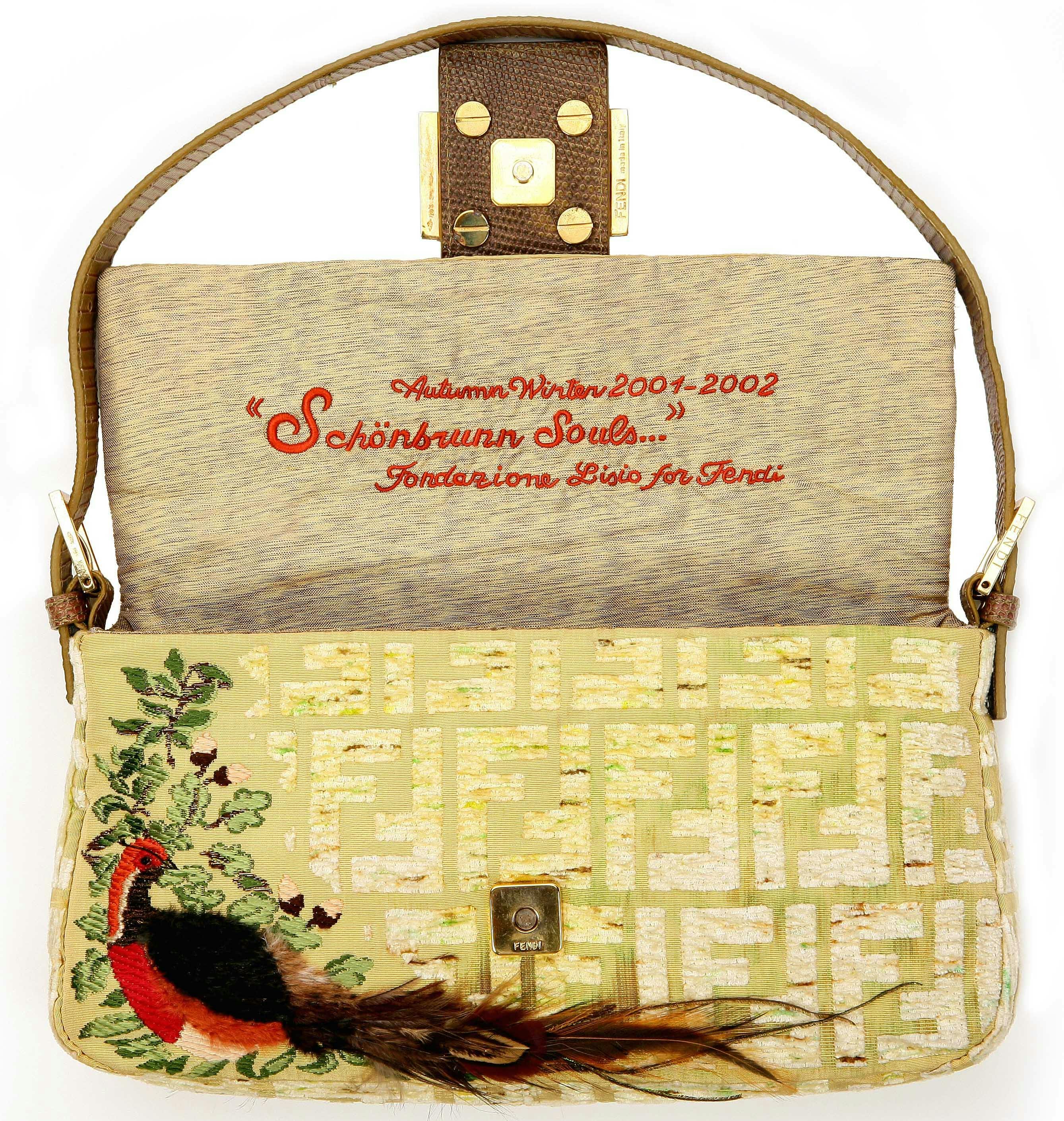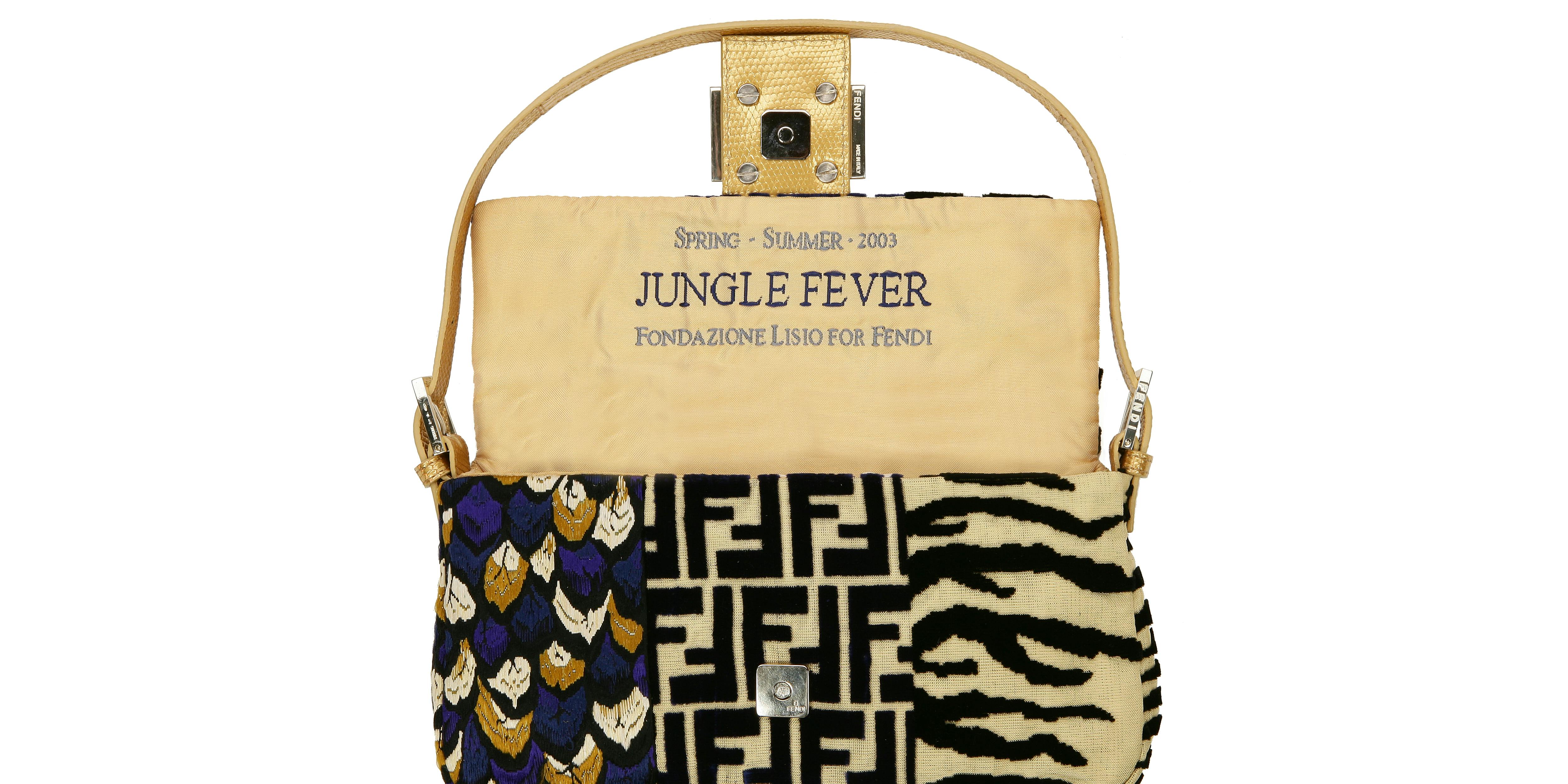 The baguette called “Jungle Fever ” is composed on a patchwork of two textiles. The first is a cut velvet with two designs: in the centre, the double F Fendi trademark and on one side a motif resembling a tigerskin. The second textile is a lampas lancé with a feather motif in silk with five colours.