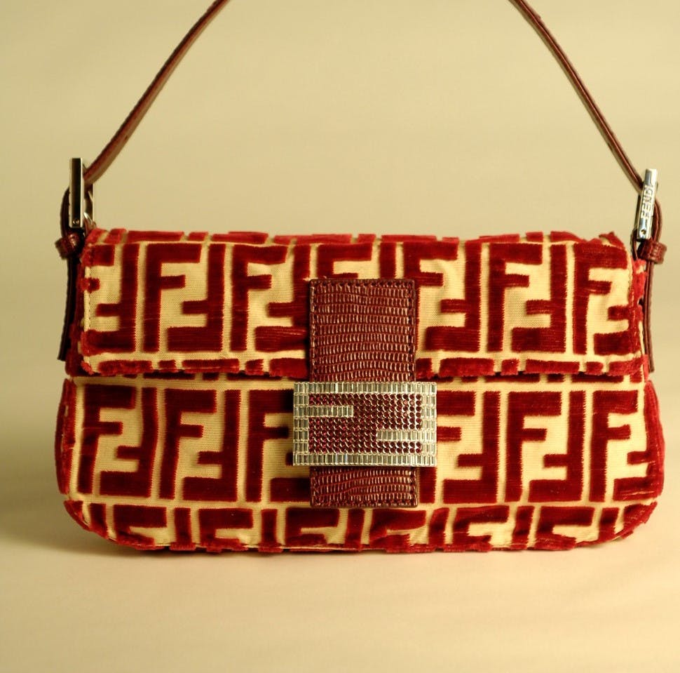 The first textile created by the Fondazione LISIO for Fendi baguettes was a velvet featuring the famous monogram of two “F”s on two staggered horizontal rows.