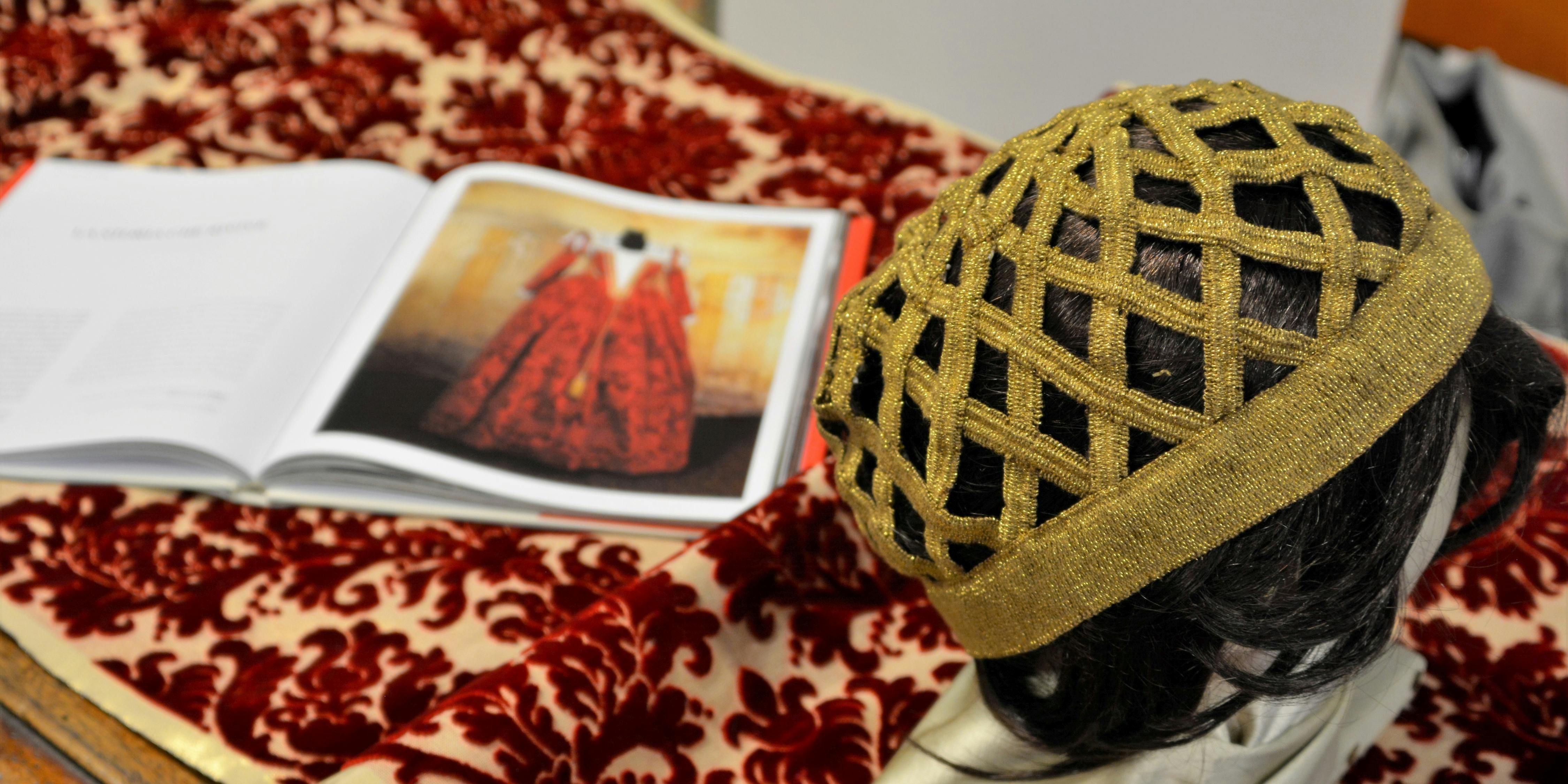 Hand-weaving of the galloons, above all for this type of head covering, would have ensured a finished product as closely as possible aligned with the original and would have permitted selection and use of a thread that resembled Laurana’s sculptural image.