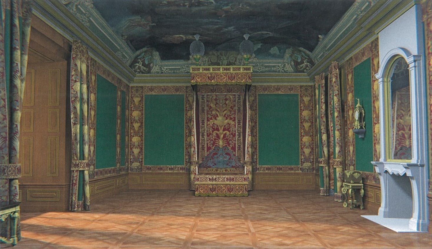 The textile reconstructions concern the wall coverings in hand-woven solid-colour silk velvet in the colours crimson and green and the ceremonial canopy bed, in Imperial style, with parts in solid-colour crimson silk cut velvet and others in embroidered golden ‘teletta’ fabric.