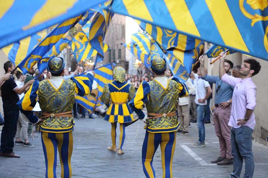 The first four liveries, presented on 9 June 2017, were stitched by the tireless women of the contrada with the support and under the guidance of an expert Sienese seamstress, while the remaining 120 liveries which go to enrich the store of costumes for the ‘Giro’ are now being sewn at the prestigious Atelier Pietro Longhi.