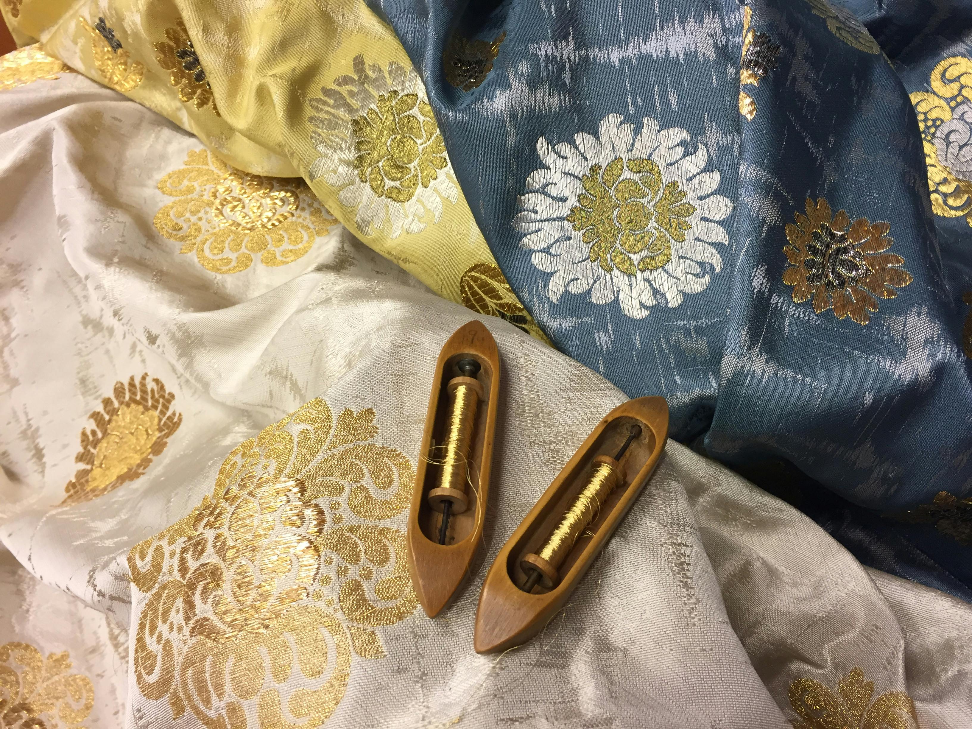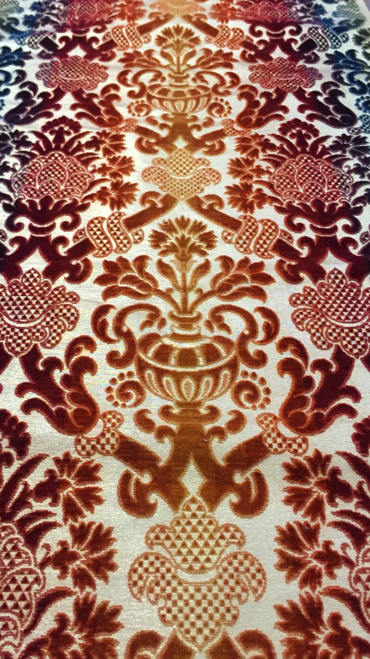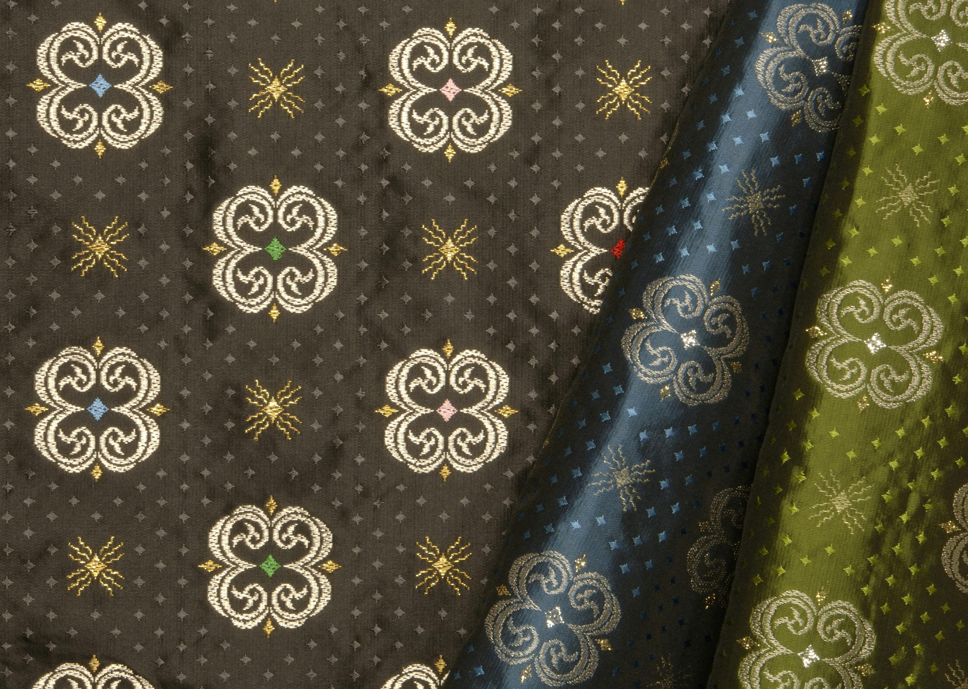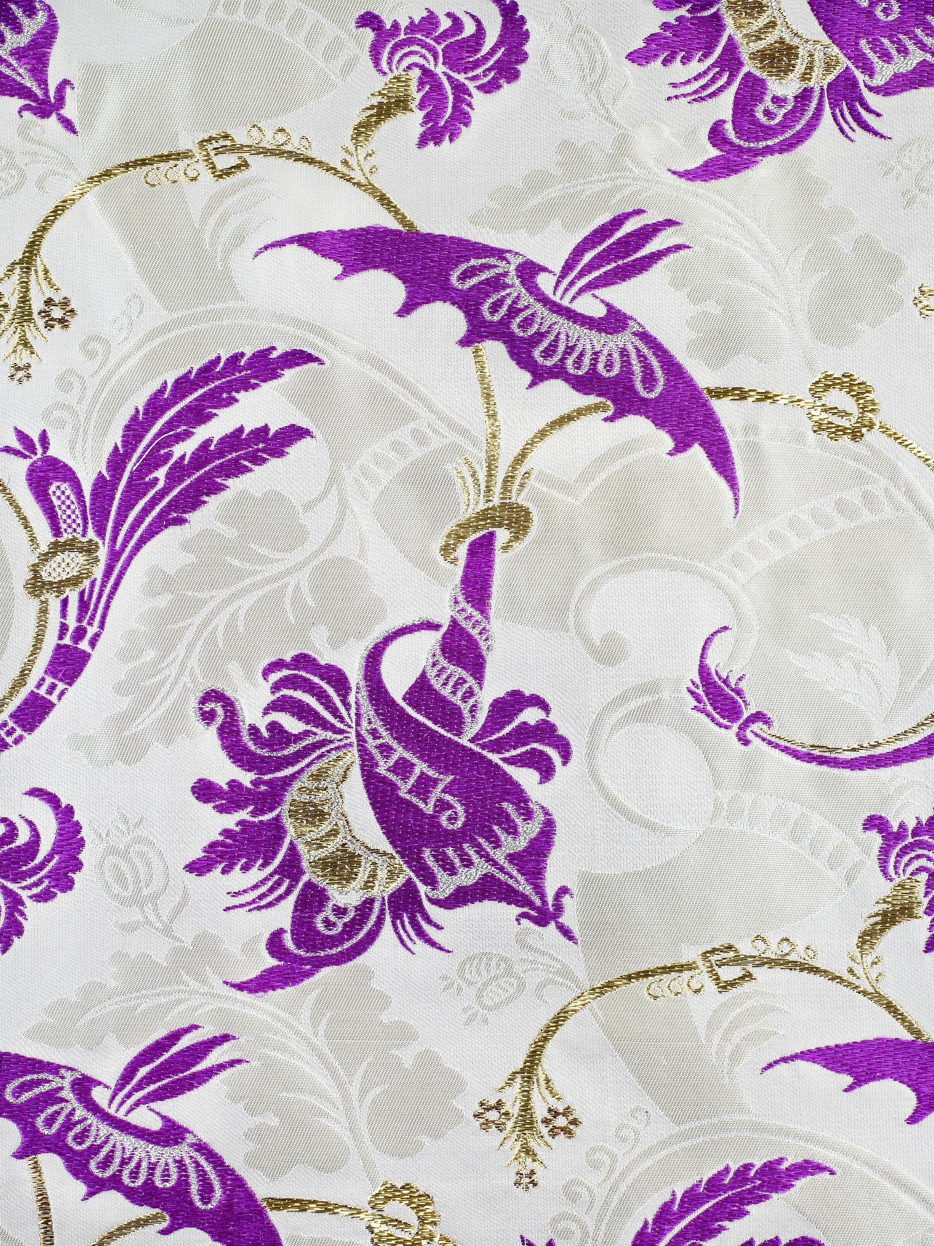 This brocade was produced for the first time by Giuseppe Lisio around 1915-1920. The pattern reproduces a fabric called "bizarre" in fashion in the early XVIII century, when the suggestions of the Far East permeate European art and arise a flourishing of exotic themes on all artifacts. Like the models, our "Samurai" is in brocade damask, a technique with which it is possible to create decorative effects on several levels of depth, imparting extreme lightness and strong dynamism to the whole.