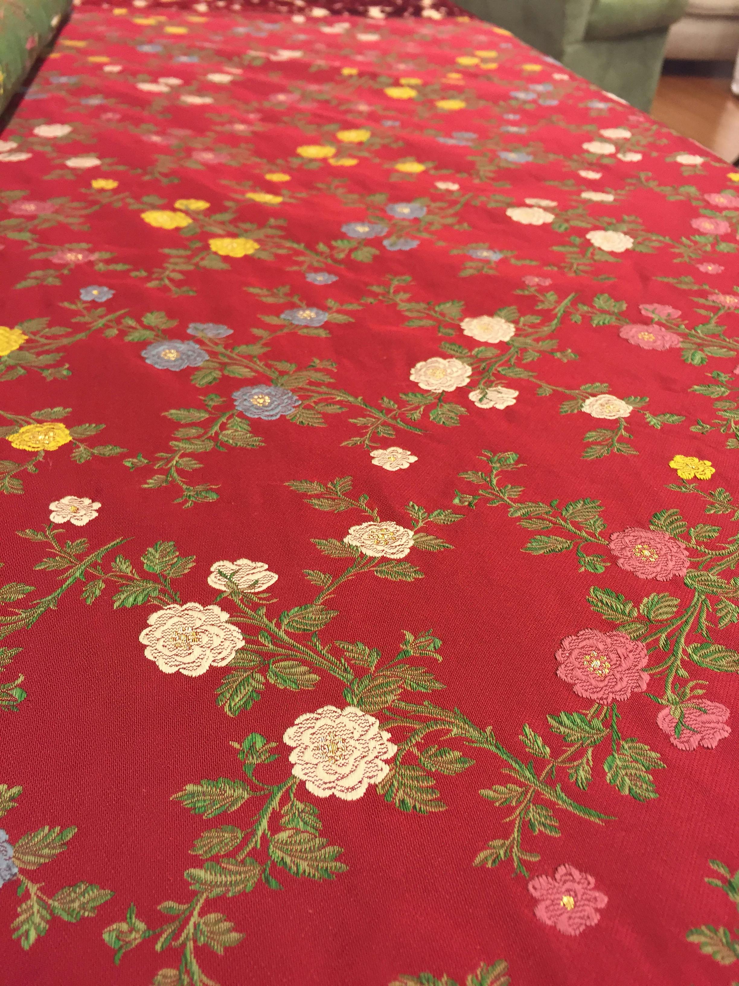 This brocade was produced for the first time by Giuseppe Lisio in the late 1920s. It reproduces a fabric of the middle of XVIII century, where the flowers are outlined with a naturalistic intent, while the compositional structure called «a meander », fashionable in the silks of this period. The "Roselline" brocade is an elaboration of the original "Rose", described above, created in 2013.