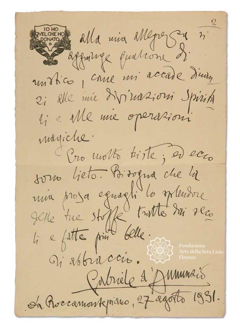 La frequentazione di figure di spicco nel panorama culturale italiano è un altro dei tratti che caratterizzò il percorso professionale e personale di Giuseppe Lisio. Su tutti primeggia l’amicizia fraterna con Gabriele d’Annunzio con il quale condivideva la stessa terra d’origine, l’Abruzzo, ma soprattutto la grande sensibilità e l’innato gusto estetico. Le commissioni per il Vittoriale furono numerose, come pure i doni che Giuseppe Lisio offrì all’amico, testimoniati nelle lettere che ci svelano anche come ogni prezioso scampolo suscitava in D’Annunzio “un’allegrezza infantile e mistica”.
