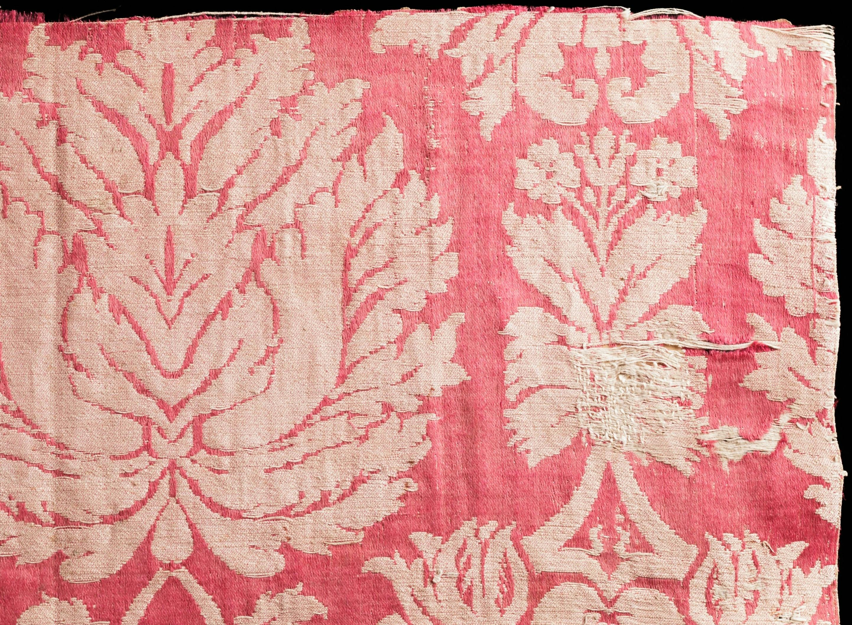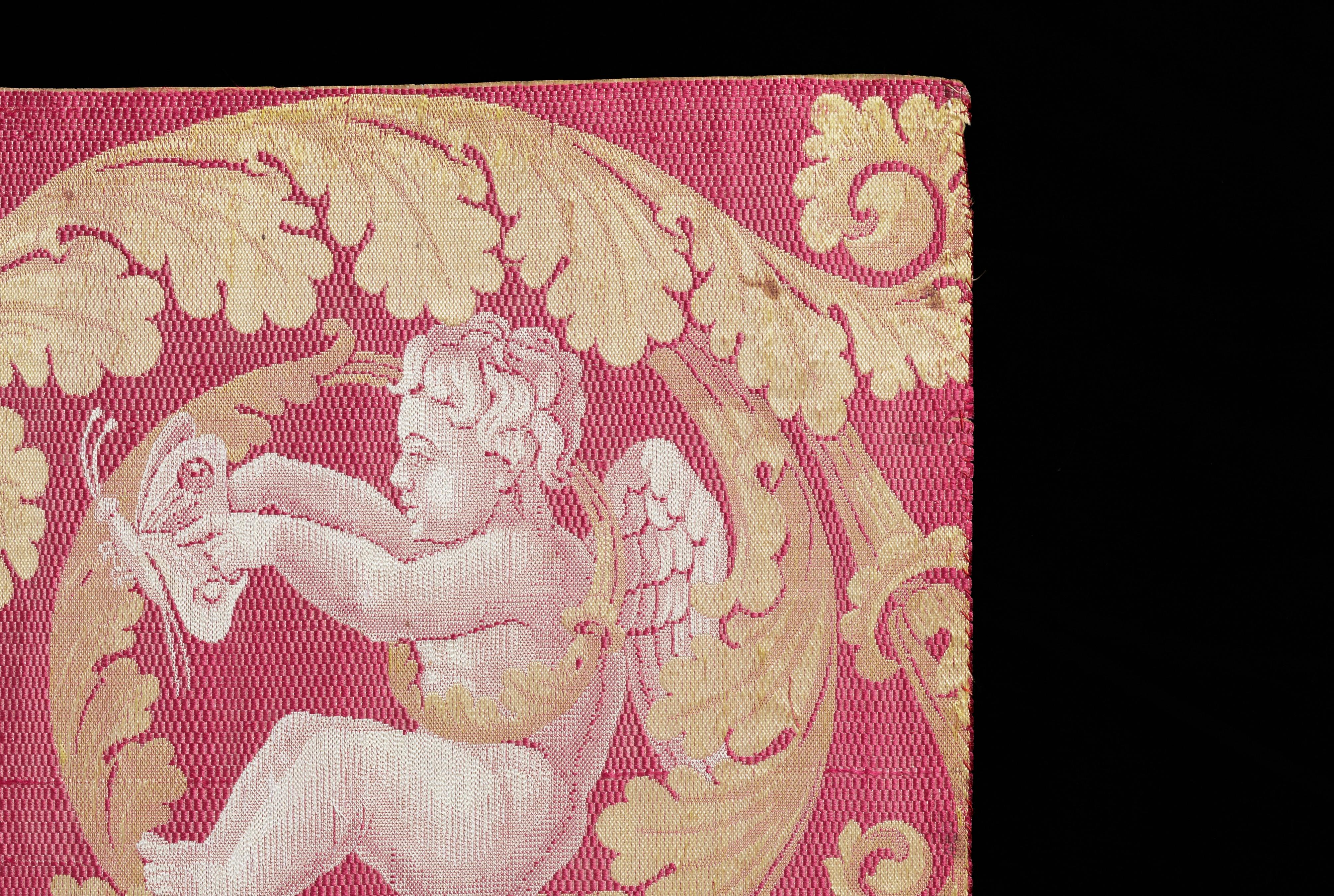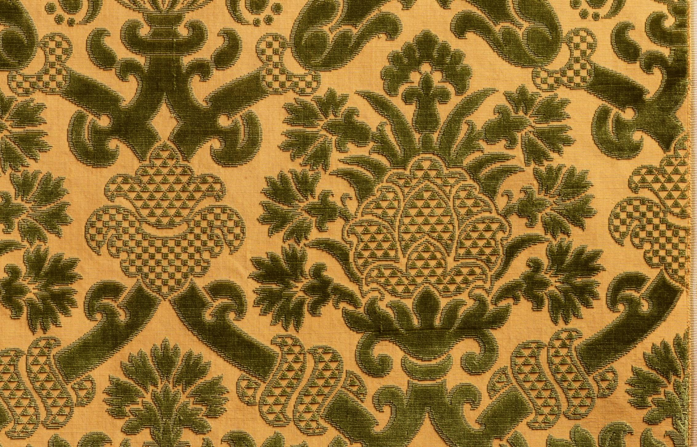 Il tessuto fa parte di una produzione fiorentina databile tra il 1530 e il 1550. Il disegno è caratterizzato da un impianto grafico a maglie chiuse con al centro una pigna, molto diffuso a partire dalla fine del XV secolo. Le ghirlande che definiscono le maglie racchiudono motivi a quattro doppie volute che fanno da cornici alle pigne. Questo tipo di disegno veniva realizzato in tecniche molto sontuose, come rasi in seta broccati in oro e argento oppure broccatelli. Il tessuto esposto è in broccatello, una tecnica tessile molto diffusa che utilizza seta e lino in trama: dà rilievo ai disegni e permette anche di contenere i costi di produzione. In questo caso è presente anche una trama in laminetta d’argento che conferisce luminosità all’insieme. La traduzione di questo disegno in velluto è avvenuta nel 1909 da parte dell’Arte della Seta Lisio di Firenze.