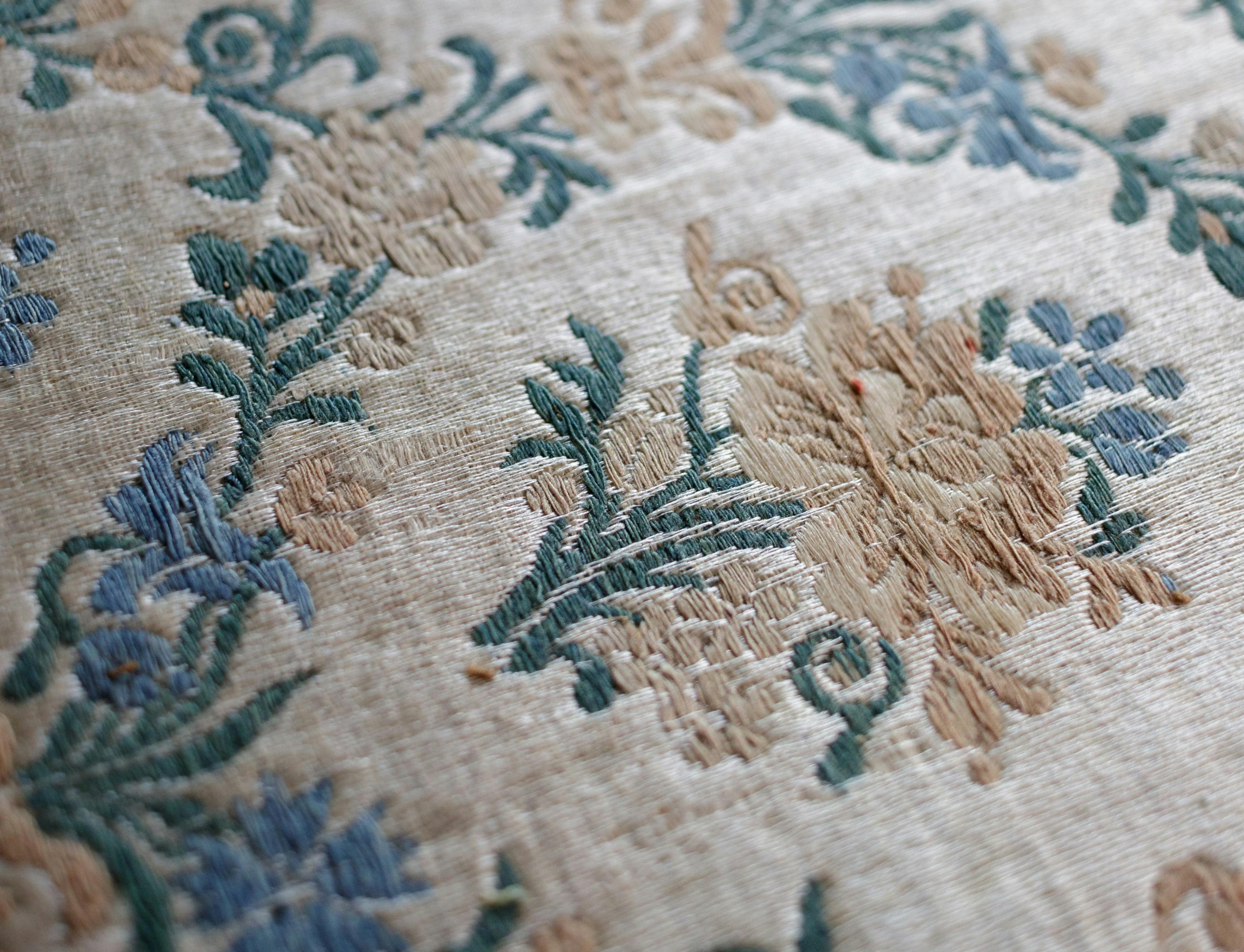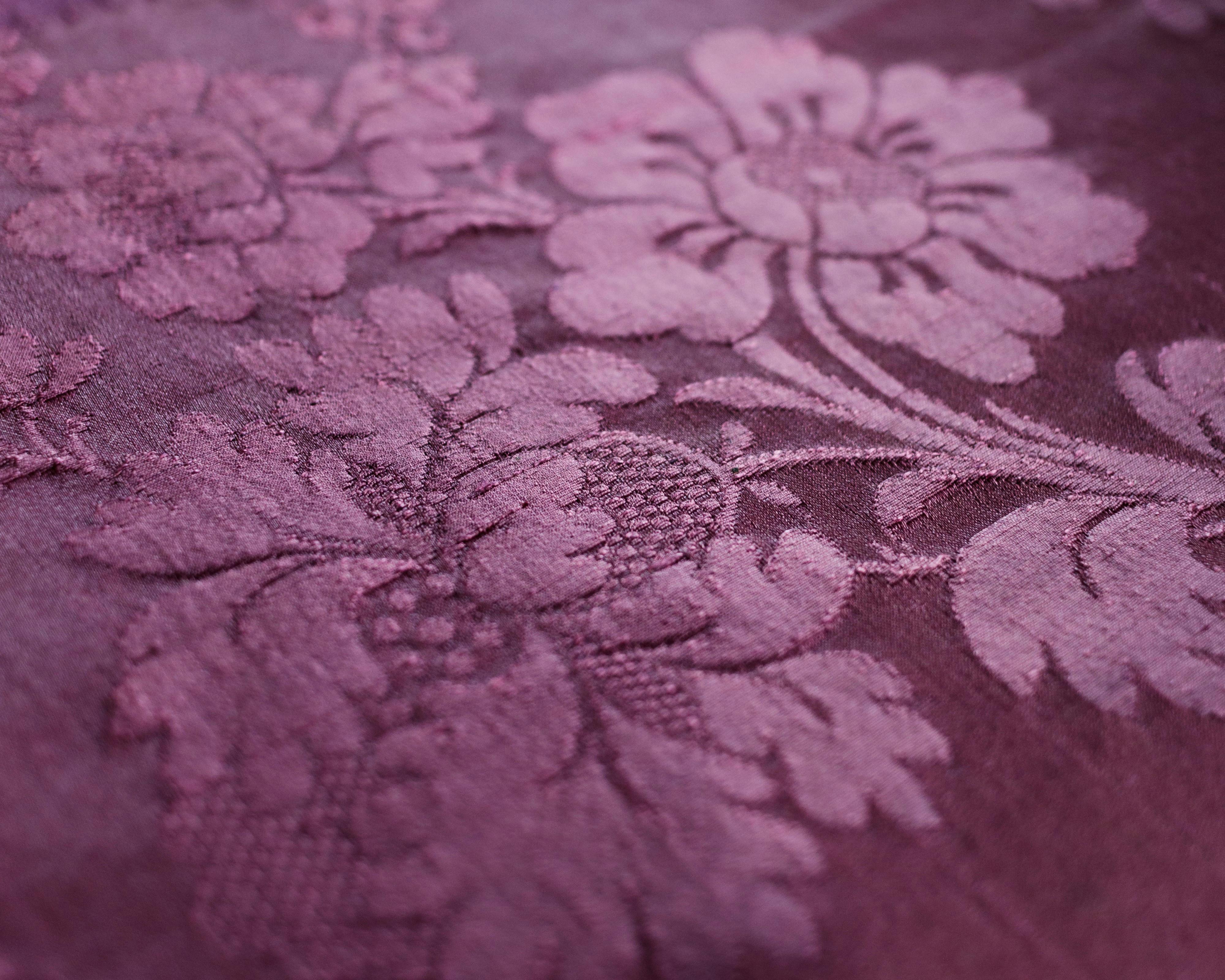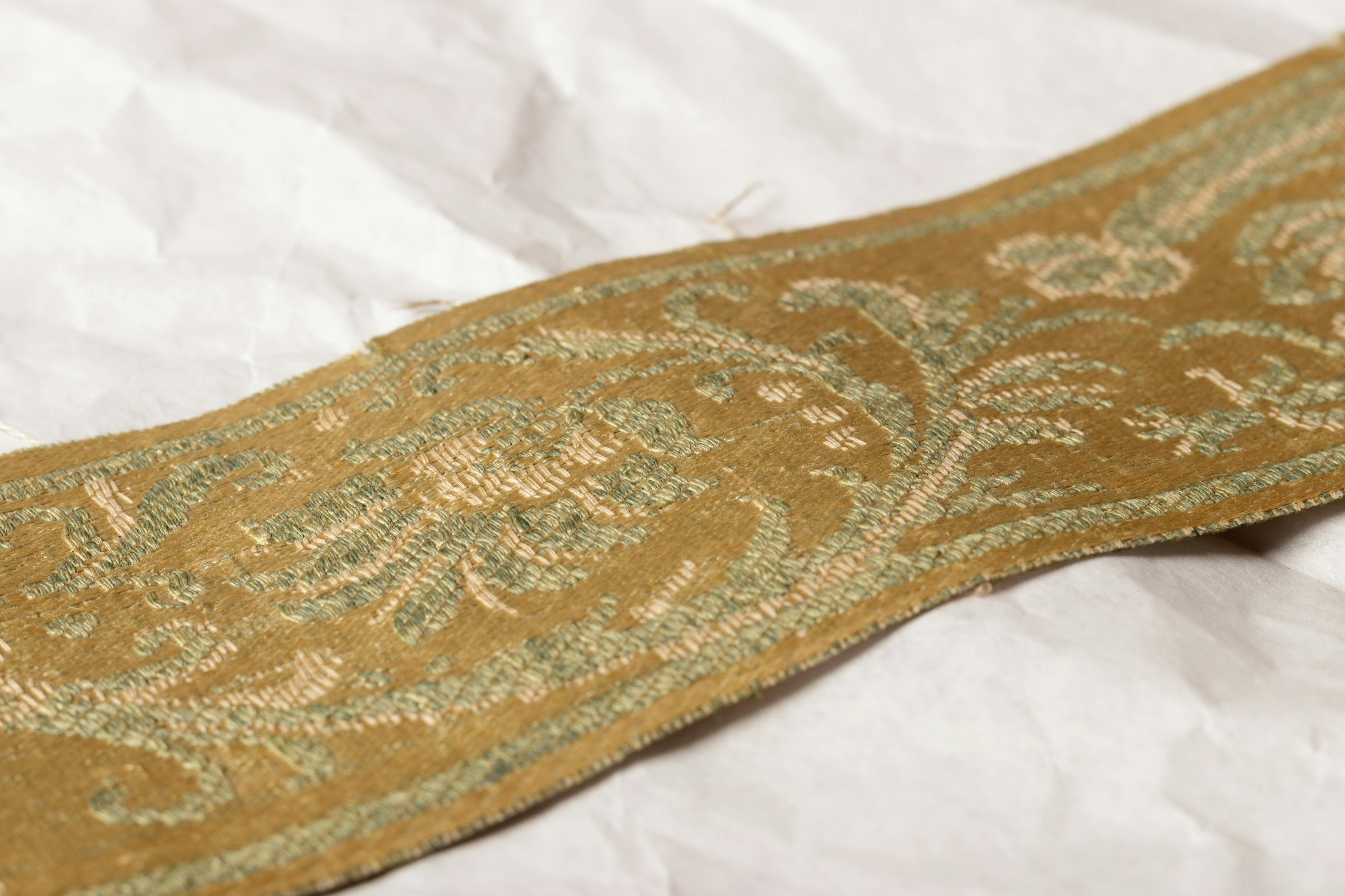 Il tessuto fa parte di una produzione fiorentina databile tra il 1530 e il 1550. Il disegno è caratterizzato da un impianto grafico a maglie chiuse con al centro una pigna, molto diffuso a partire dalla fine del XV secolo. Le ghirlande che definiscono le maglie racchiudono motivi a quattro doppie volute che fanno da cornici alle pigne. Questo tipo di disegno veniva realizzato in tecniche molto sontuose, come rasi in seta broccati in oro e argento oppure broccatelli. Il tessuto esposto è in broccatello, una tecnica tessile molto diffusa che utilizza seta e lino in trama: dà rilievo ai disegni e permette anche di contenere i costi di produzione. In questo caso è presente anche una trama in laminetta d’argento che conferisce luminosità all’insieme. La traduzione di questo disegno in velluto è avvenuta nel 1909 da parte dell’Arte della Seta Lisio di Firenze.