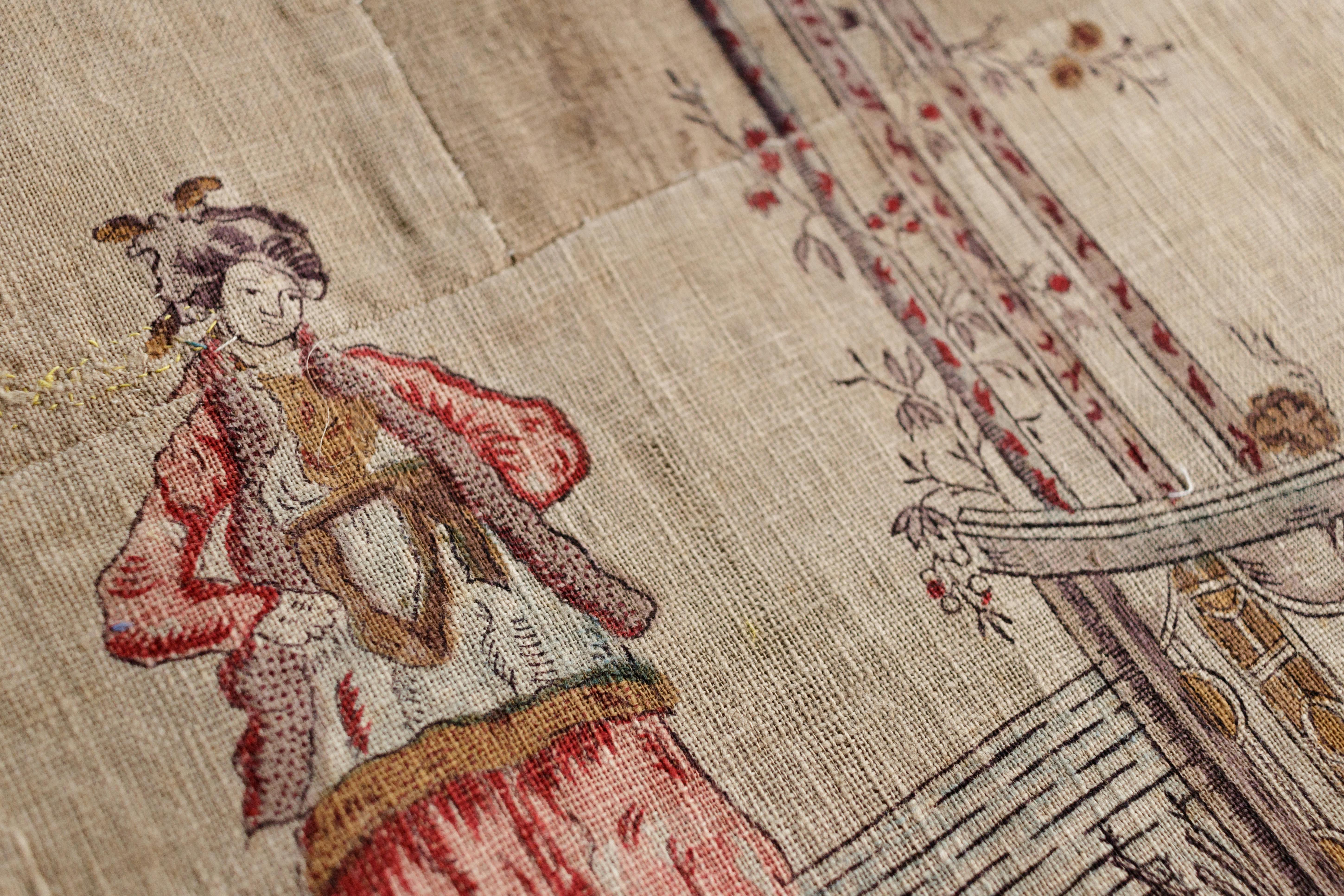 L’abito di Gian Gerolamo Grumelli detto Cavaliere in rosa, ritratto dal famoso pittore Giovanni Battista Moroni, è in raso di seta (rosso corallo) con ricamo in fili d’argento e si avvicina cronologicamente al tessuto esposto. Il ritratto è infatti datato 1560 e il vestito riflette la moda di metà Cinquecento. In quest’epoca il colore rosa e il rosso erano simbolo di ricchezza per la rarità delle materie e la complessità dei processi tintori.