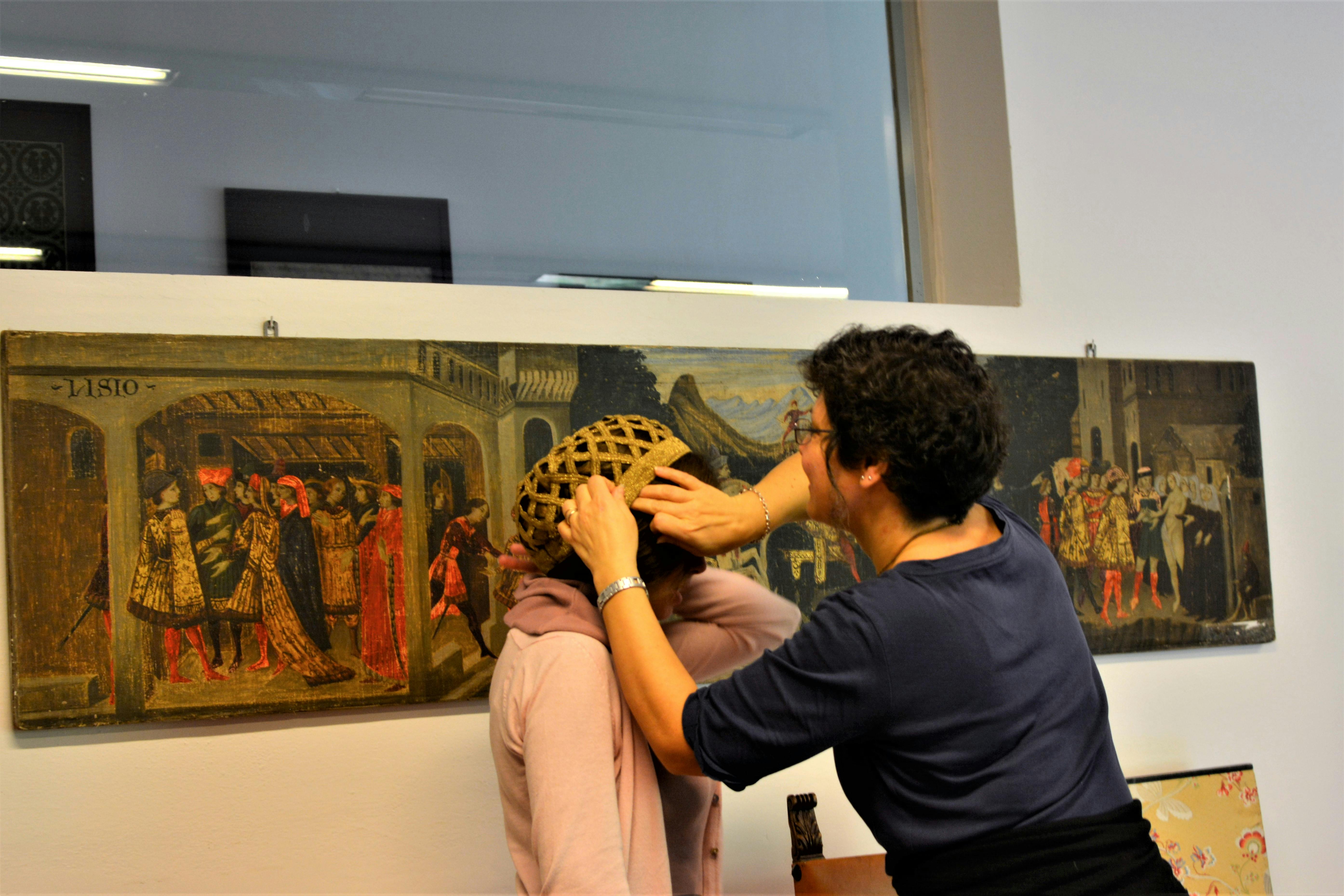 La tessitura manuale dei galloni, soprattutto per questa tipologia di copricapo, avrebbe assicurato una realizzazione più vicina possibile all’originale e avrebbe permesso la selezione e l’utilizzo di un filato che si avvicinasse all’immagine scultorea di Laurana.