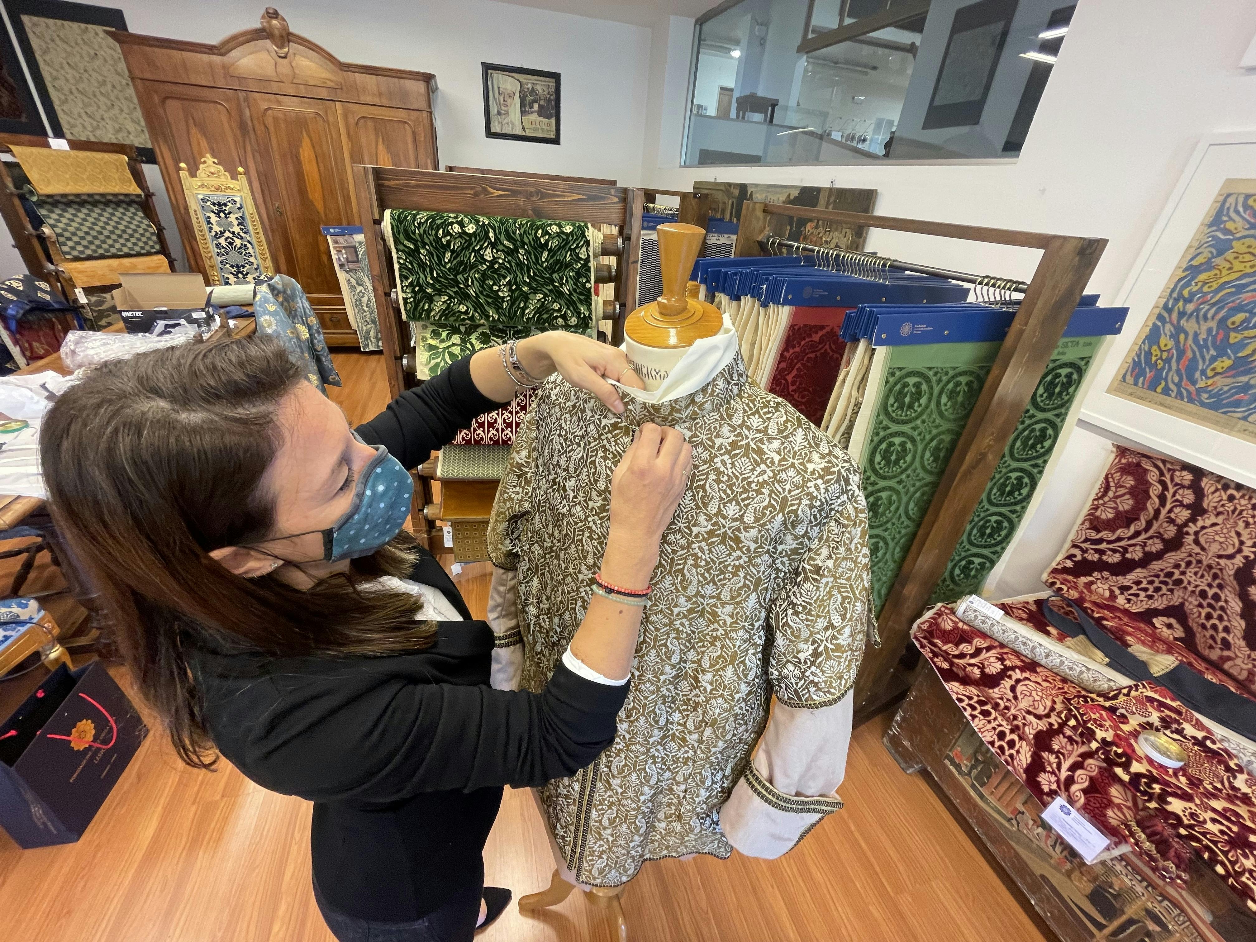 A questo punto con il campione del “Lorenzetti” appena tessuto si è passati alla ricerca del secondo tessuto che compone le maniche e la veste interna e la passamaneria.